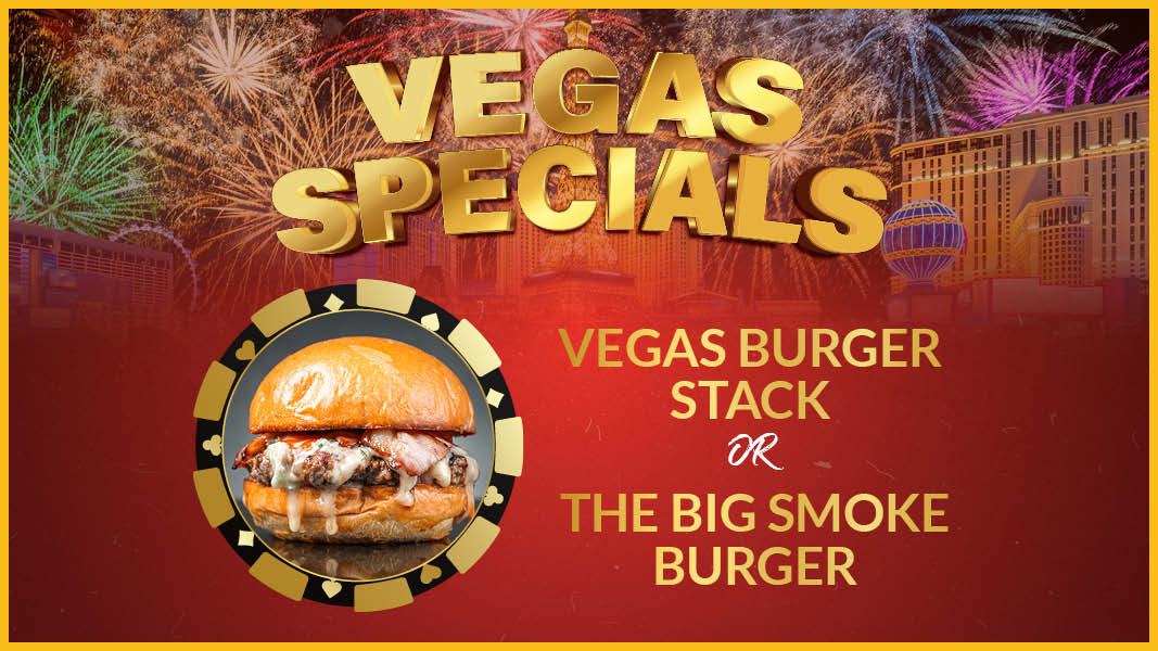 Treat yourself to a burger experience done Vegas style! Choose between the Vegas Burger Stack with smashed Angus beef, American cheese, pickles, crispy onion rings and comeback sauce. Or go bold with The Big Smoke Burger, loaded with chilli bacon jam, maple-glazed bacon, American cheese, crispy onion rings and comeback sauce. Both served with golden French fries for the ultimate feast.